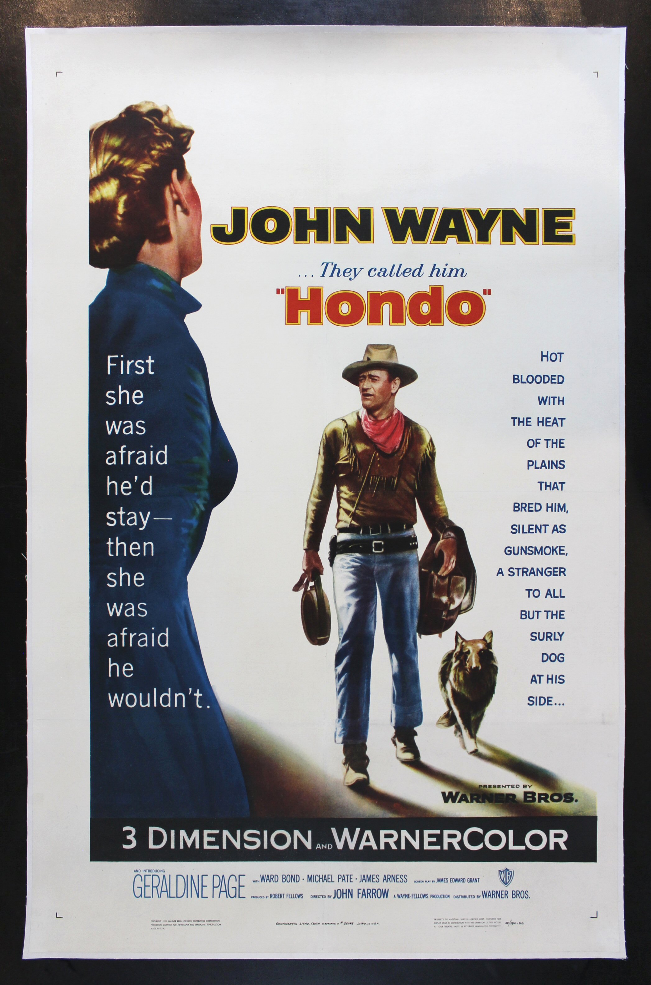 HONDO movie poster film poster one sheet 1953 JOHN WAYNE US 1 One Sheet Original Movie Poster 27x41 EX C8 Linen Backed Ready for Framing $2195.00 SOLD Special Order Typical very minor fold line touch up/restoration. Looks beautiful!! Well preserved. Prior to linen backing there were very minor fold separations and a few pinholes. |